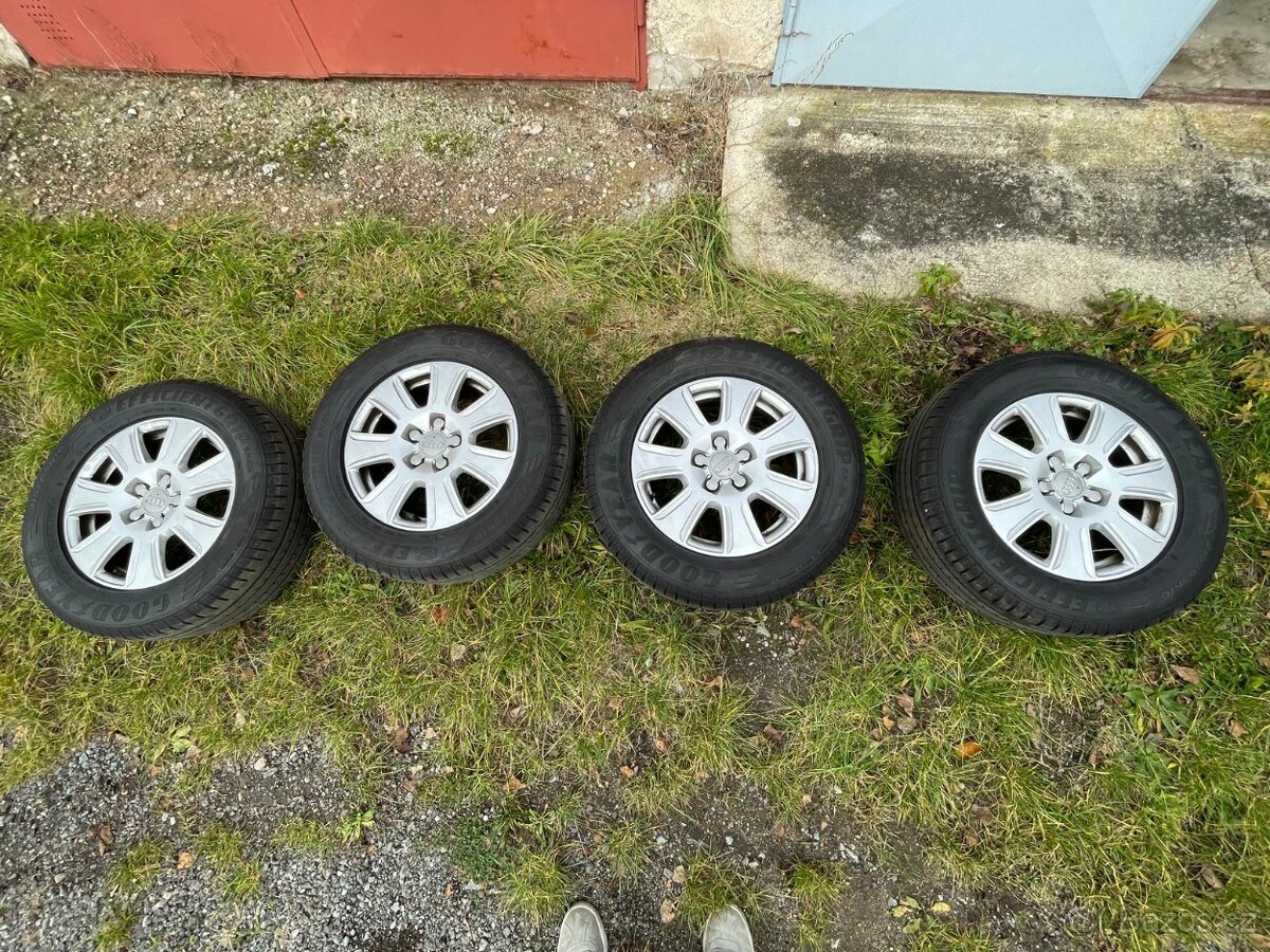 Prodám komplet sadu originál Audi 16x6,5J, ET 33, rozteč 5x112, středová díra 57,1mm. Možné použit i na vozy Škoda a Vw. Včetně Letních pneu GoodYear 215/65/16 se vzorkem 4,5mm