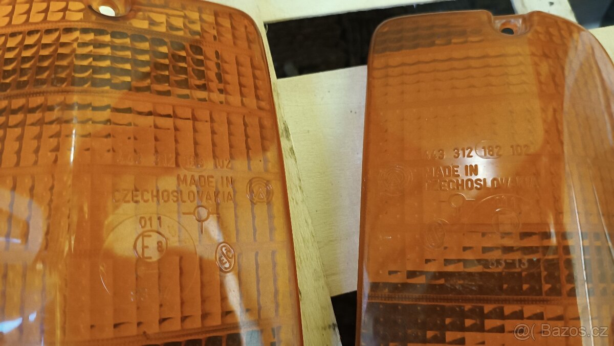 Sklíčka blinkrů Škoda 1000mb 1100mb - [15.12. 2025]Sklíčka na blinkry, 2 nové, jedno použité ale pěkné. Za ty leta skladování se pár škrábanečků najde (viz foto). Cena za celek.