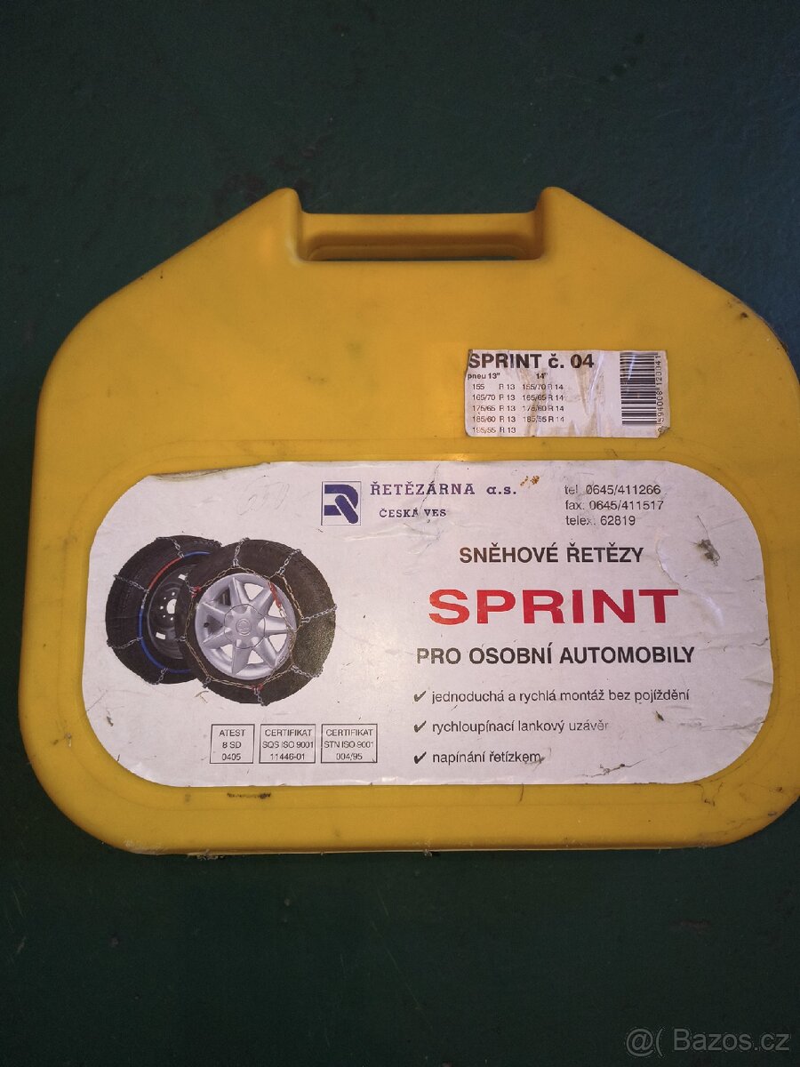 Sněhové řetězy rychloupínací, křížová stopa, sada - [26.11. 2025]2 kusy. Určeno pro vozy do hmotnosti 2000kg. Homologace GS TÜV, tloušťka očka řetězu 3mm, šířka očka 9mm. Baleno v praktické uzavíratelném plastovém kufříku. Cena: 100 kč. Odpověď do emailu. Kdyně.