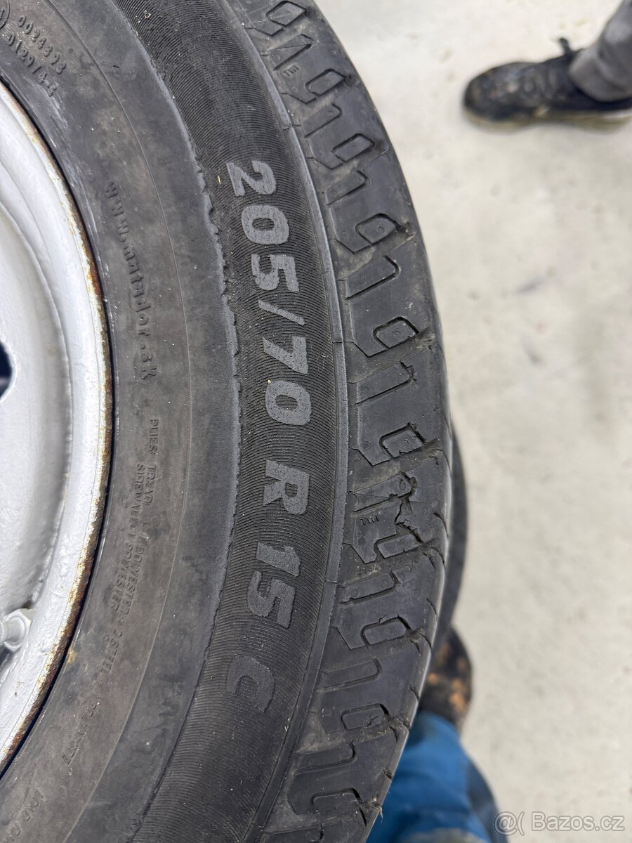 Prodám letní pneu včetně plechových disků sada 4 kusy sundané z Boxera 205/70r15c hloubka dezénu na fotce