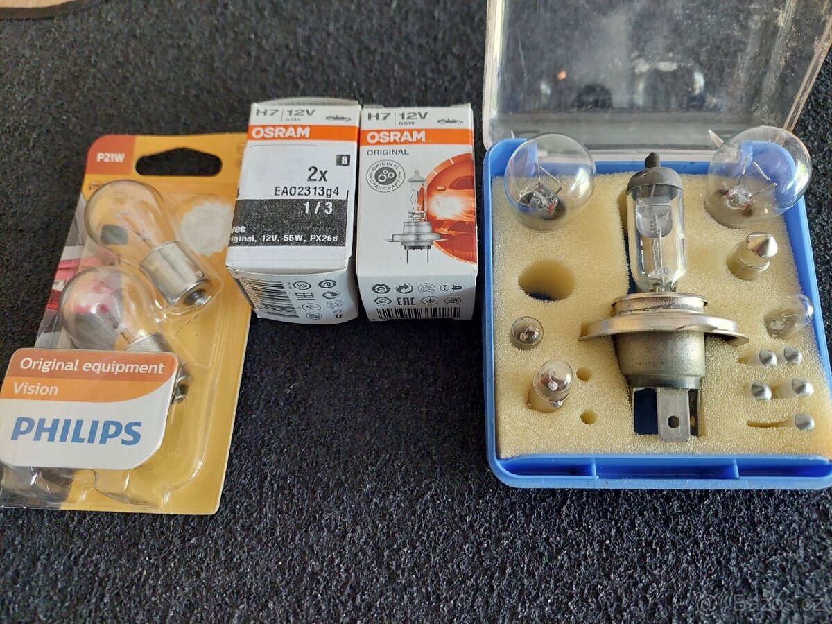 Nabízím žárovky do starších aut - 1x H4, 2x H7, několik obyč 12V. Viz foto. Nepoužité. Ideálně vše spolu. Brno, s poštovným se to neoplatí...