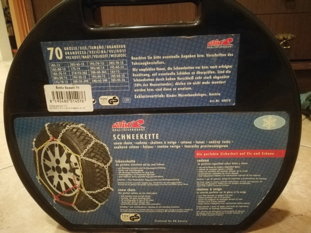 Prodám NOVÉ - nepoužité sněhové řetězy viz foto. Lze předat v Praze/Petrov u Prahy.