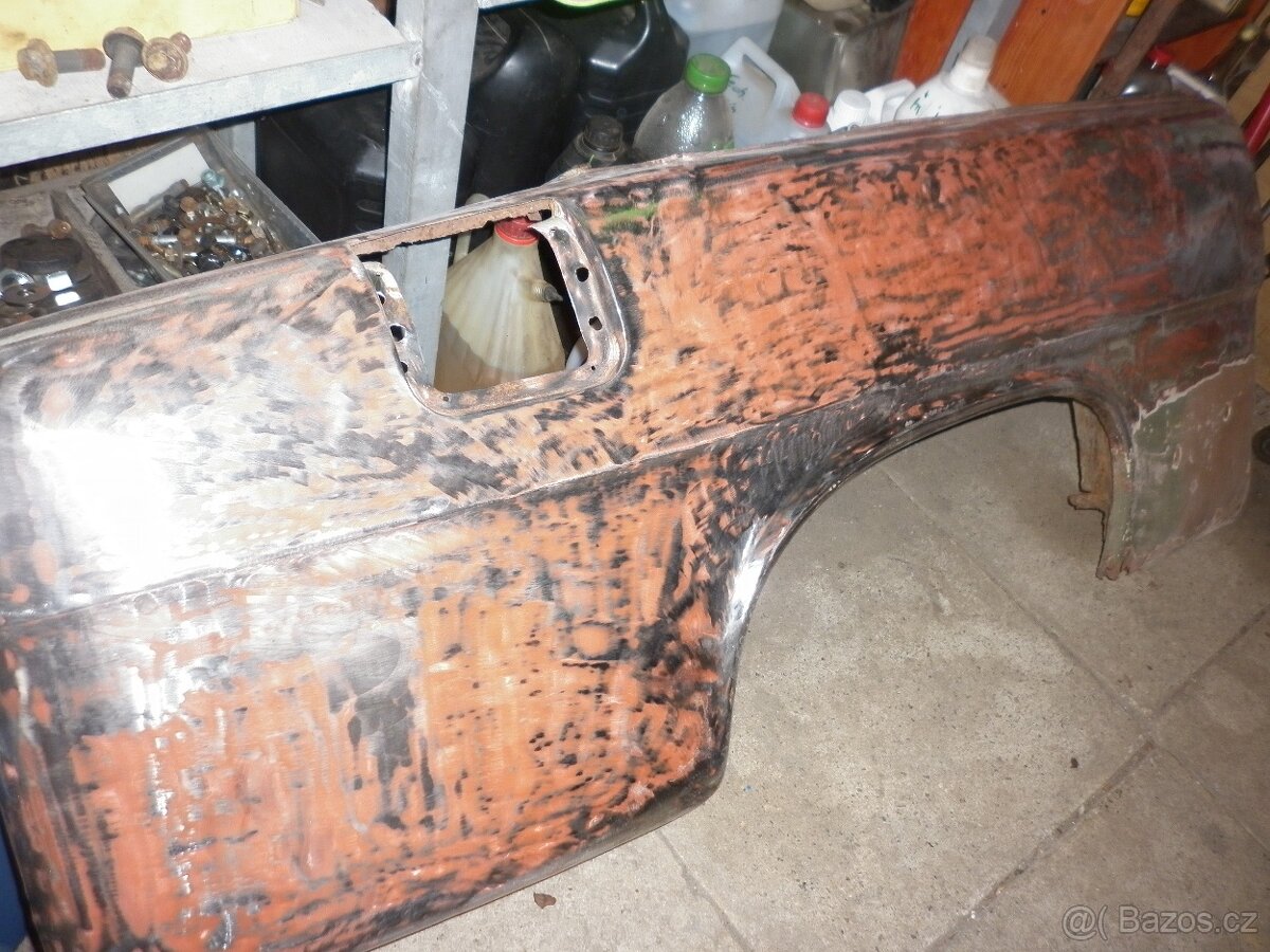 Zadní blatník velice slušný stav.Obroušeno na plech. Už mám jenom pravý