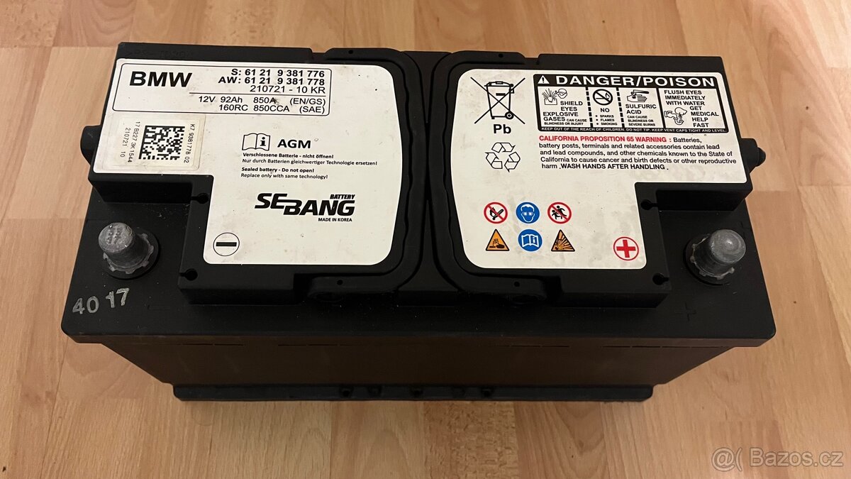 Prodám 12V AGM autobaterii BMW Sebang 92Ah 850A. Baterie je funkční a úměrná svému stáří z roku 2017. Rozměry 353x175x190mm.