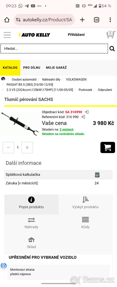 Prodám nové přední tlumiče SACHS. Koupil jsem je, ale jsou spíš na naftové auto (mam benzínového passata B5). Nové stojí 3980 v auzokelly. Tyto prodám za 2000 oba dva. SA 316990. Jsou pro Audi, vw, skoda, audi