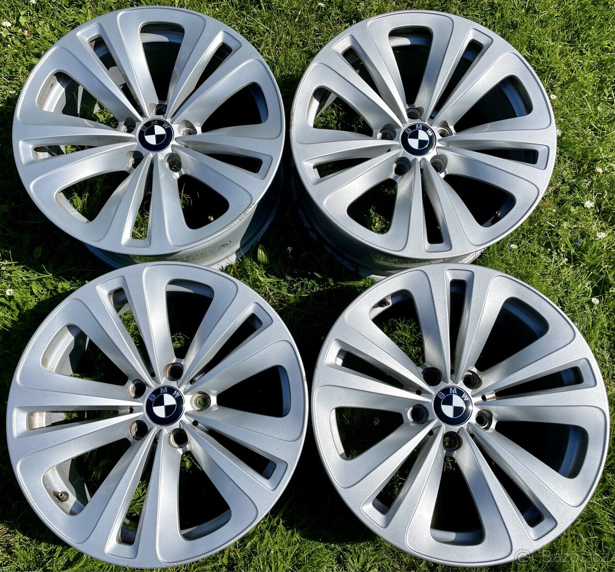 Na obvodu tří disků je nějaký škrábanec z provozu (viz foto), jinak jsou v pěkném stavu. Vnitřky disků jsou trochu zašlé. Stav je zohledněn na ceně. Samozřejmě včetně nových středových pokliček BMW.