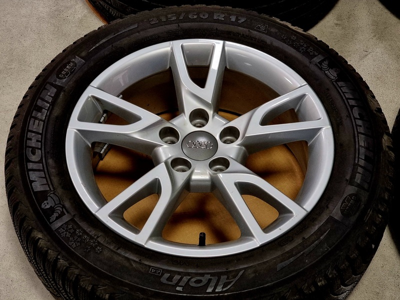 Sada originálních alu AUDI Q3 v rozměru 6,5x17" a rozteči 5x112 vhodné i pro Ateca, Karoq a Tiguan. ET 33. Středová díra 57,1mm. Včetně zimních pneu MICHELIN Pilot Alpin 4 (2ks) a PIRELLI Sottozero Winter (2ks) v rozměru 215/60 R17 96H (7,1mm + 6,8mm + + 5,4mm + 5,4mm vzorek). Kola jsou jako nová, jsou naprosto rovná a bez oděrek. Kola jsou v leskle stříbrném provedení. Číslo originálního dílu AUDI = 8U0 071 497 (8U0071497).