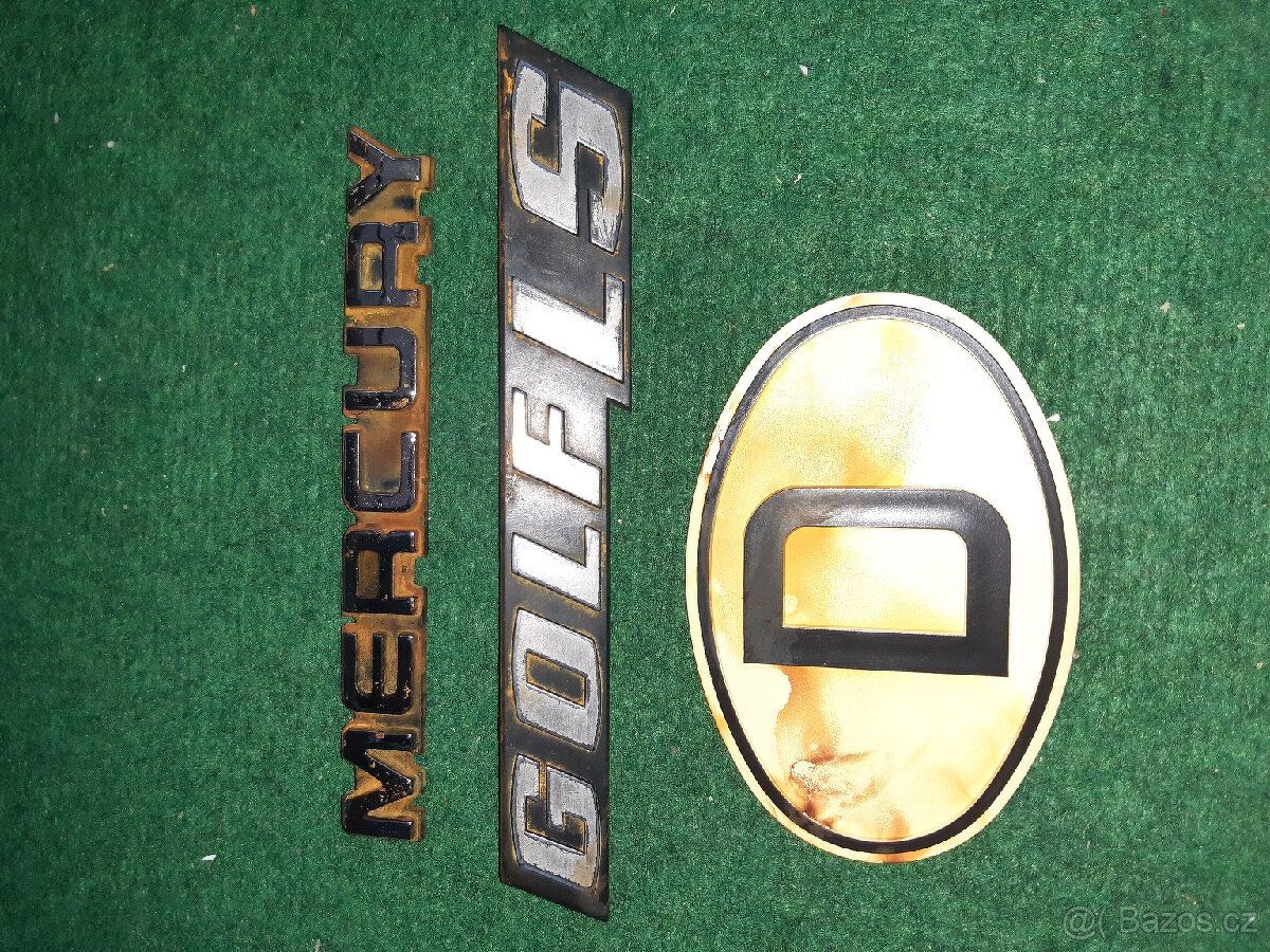 Prodám tyto staré-retro nápisy-loga z aut (Golf LS,Mercury,D).Cena za vše.