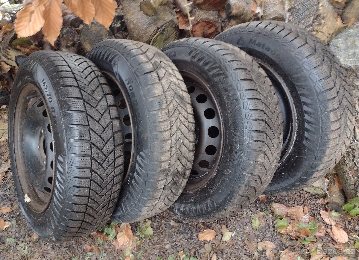 ZIMNI PNEU 165/70 R14 T MATADOR NORDICCA, zánovní, najeto 2.387 km, hl. des. 7,3mm, DOT 23/22, vč.plech. disků, vhodné na FIAT Punto, Tipo, Panda, Uno, Tempra, Regata, Bravo, Brava, Croma, Marea, Stilo, Coupe, LANCIA Y, Prisma, Delta, Dedra, Thema, Lybra, SEAT Ibiza, Malaga, Ronda, Marbella, ALFA ROMEO 33, 75, GTV, 33 SPORT WAGON, 145, 146, 155, 164 atd., cena 490,- Kč/ks, odběr ihned v TU nebo možno zaslat po celé ČR 98,- Kč/ks, tel.777121007