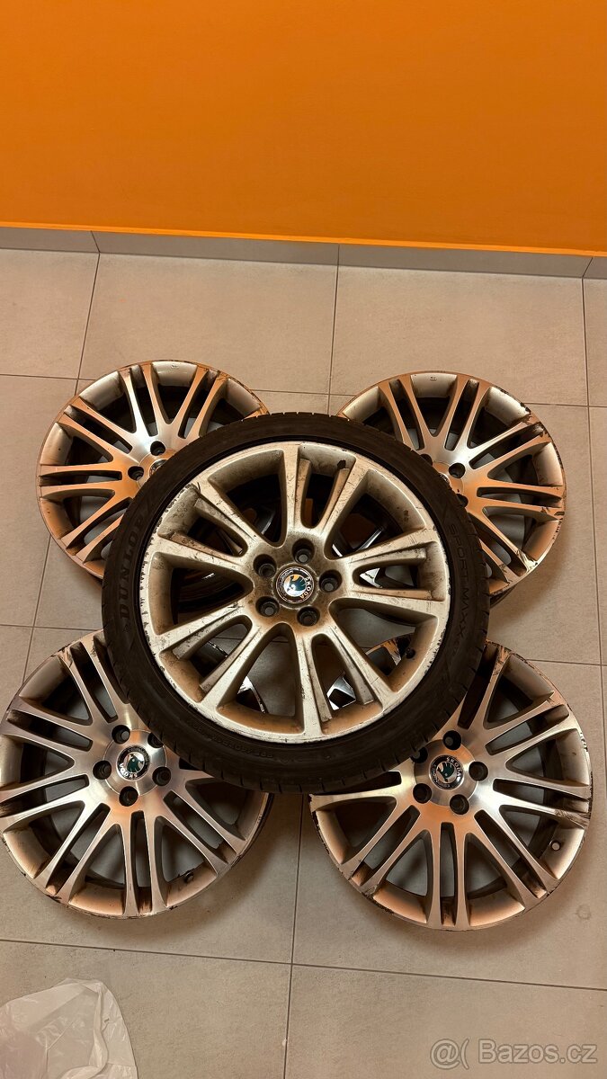 Prodám Alu disk ze Škoda Octavia 2 RS. Originál Škoda viz. foto, které bylo používané jako rezerva s novou gumou 225/40ZR18 92Y Dunlop Sportmaxx RT2 s diskem 5x112, 7 1/2 x R18 ET 51.
