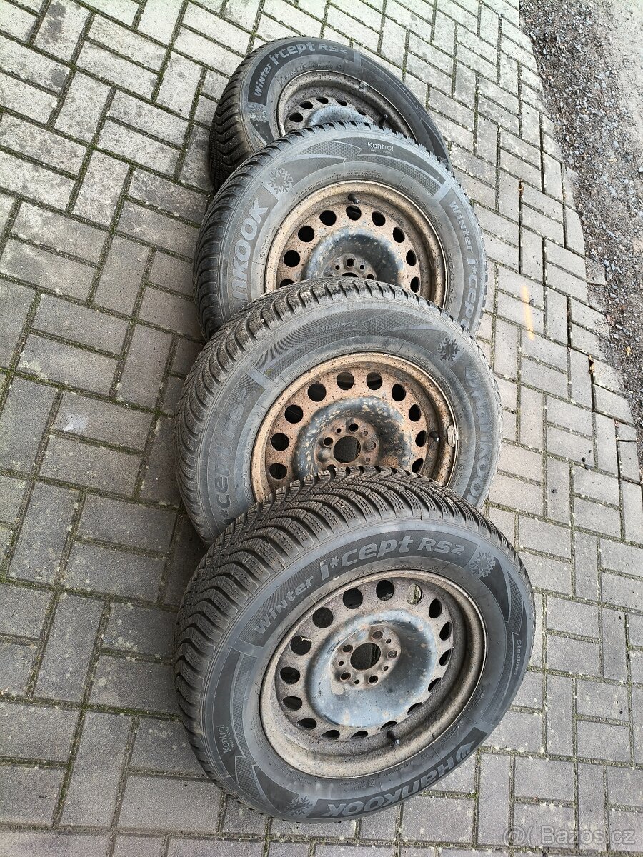 Prodám sadu 4 zimních pneumatik 215/65 R15 96H výrobce Hankook. 2 pneu mají vzorek cca 5 mm a 2 cca 7 mm. Pneumatiky jsou na plechových discích 6,5J, středový otvor 58 mm, ET27, díry 5x98.