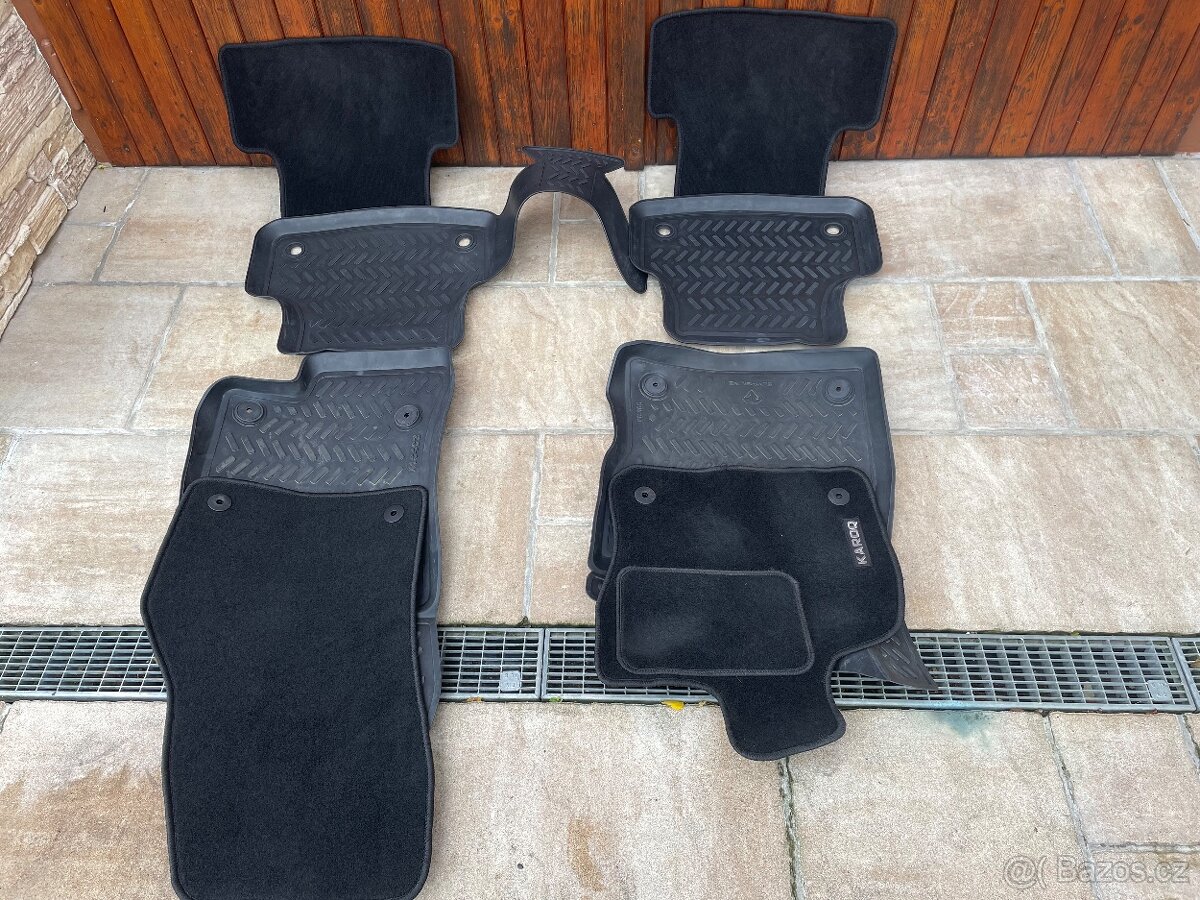 Prodám auto koberce Škoda Karog.Koberce gumové i textilní v zachovalém stavu.Cena za obě sady 1200kč