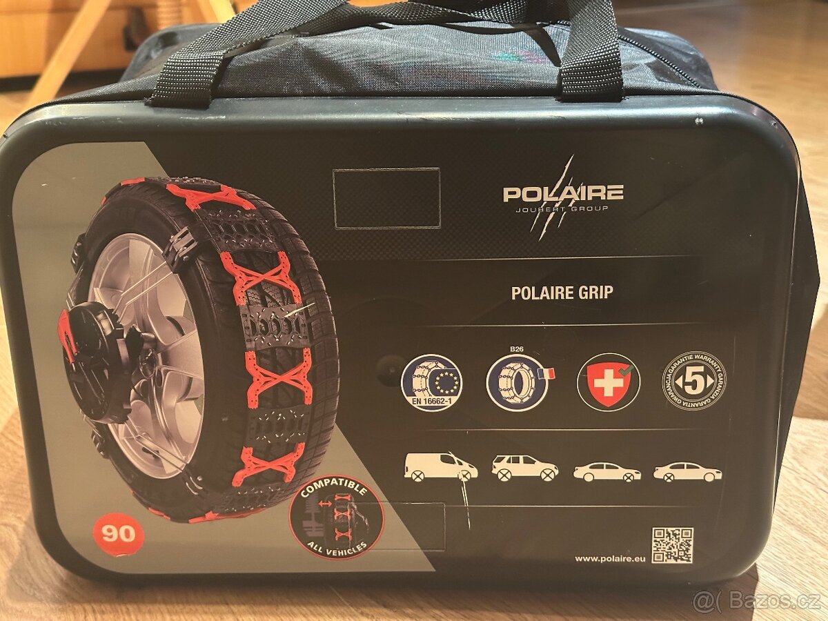 Nepoužité sněhové řetězy Polaire Steel Grip - Rychlé a snadné nasazení. Ideální pro vozidla, na které nejdou nasadit klasické řetězy. Pouze 7mm na běhounu. Žádný kontakt s ráfky kol, eliminuje riziko poškrábání. Automatické napínání a centrování. Vyhovuje normě Ö-Norm V 5117.
