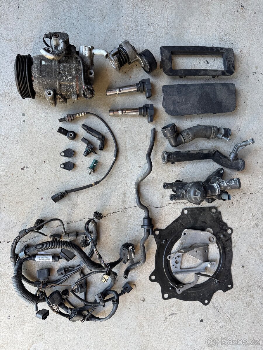 Klima kompresor, elektrické vedení motoru, 2x zapalovací modul, čidlo klepání, oleje, na kliku, kladka, lambda, kryty radia, plech pod spojku, termostat s čidlem teploty, odvzdušnění, sada držáků.