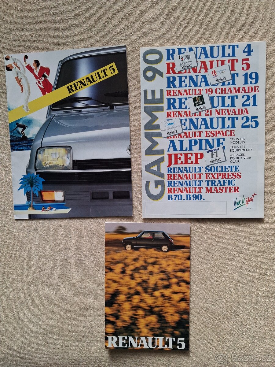 3×prospekt Renault 5.1×8 stranek A4,francouzsky text.1×23 steanek,velmi detailni sesit se vsemi modely v nabidce.1×24listu A4,fok 1990-kompletni nabidka vozu Renault.Cena 900kc +posta.