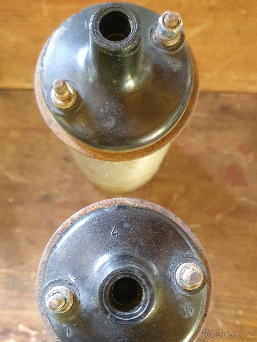 cívky zapalování 6V, 2ks, jedna má defekt plechového krytu viz foto, ale obě jsou plně funkční, 350 Kč/ks