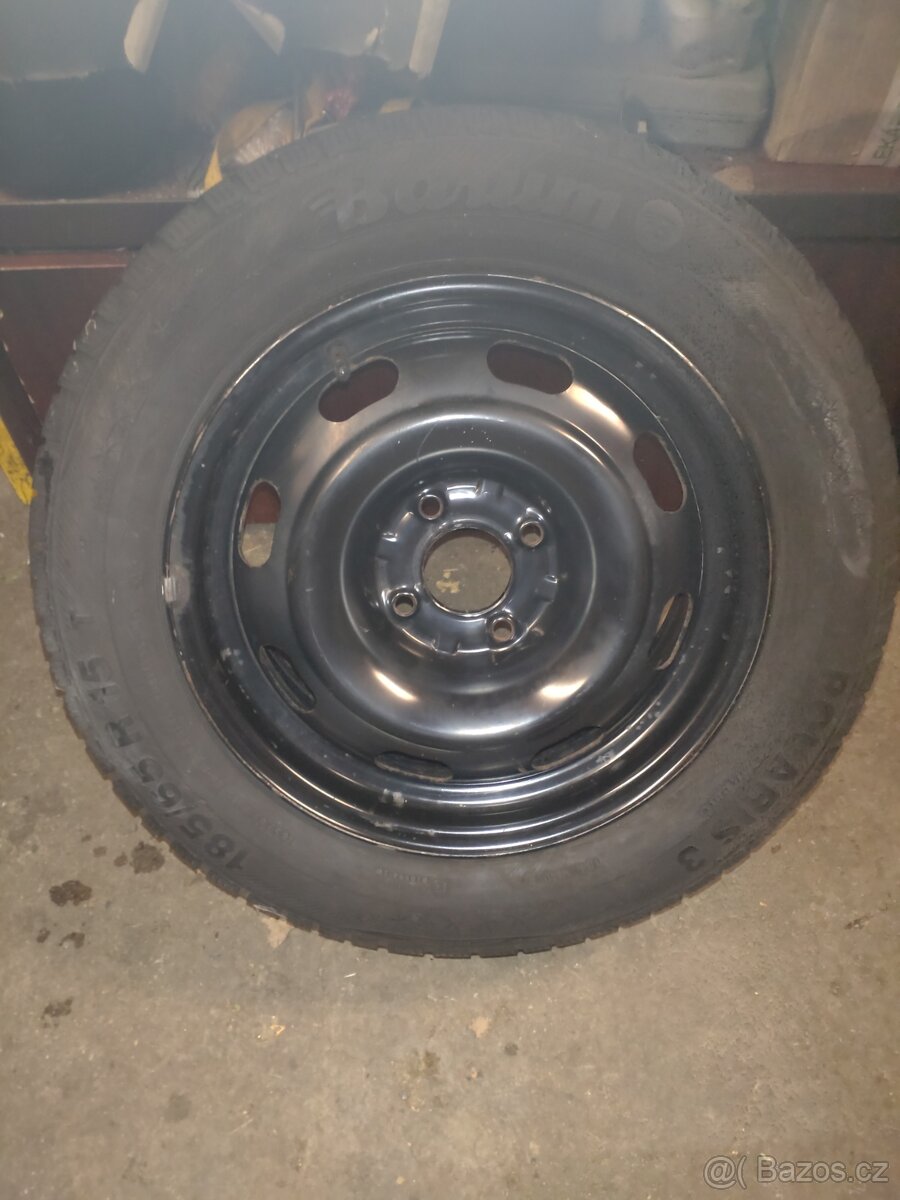 Prodám toto kolo. Vhodné jako rezerva. Bylo v Peugeotu. Rozměr pneu 185/65 R15. Vzorek 4mm. Et27. Středová díra 65mm.