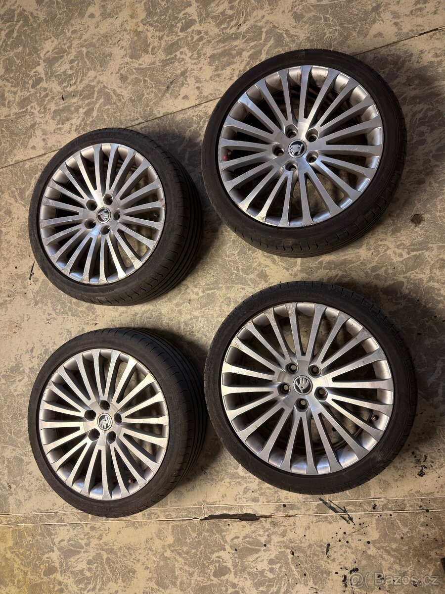 Prodám alu kola na Škoda Superb . Kola jsou vyvážená a nekopou jsou jen odřené viz. foto. Vhodné na renovaci. Letní pneu Sava 225/40 r18 se vzorkem 4-5mm, DOT 2023