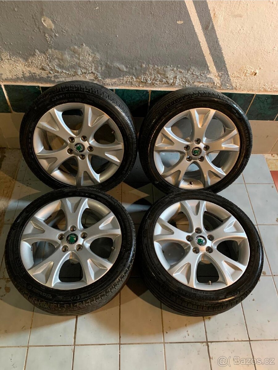 Prodám originální r17 kola škoda Pallas s letními pneu 225/45/17. Rozměr disků 7Jx17 et54. 5x112. Kola mají TPMS elektronické senzory (snímače) tlaku v pneu. Tím pádem bohužel trochu koroze kolem ventilků. Cena 12tisíc.Kontaktujte mě spíše sms. Nebývám stále na telefonu.