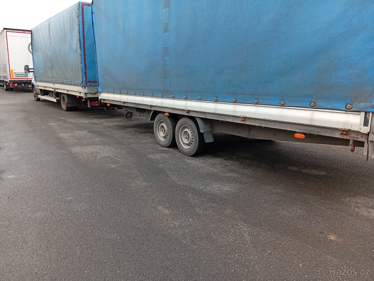 Přívěsný vozík dvouosý Vezeko,R.v.2020,bočnice,shrnovací plachta,bržděný, sada náhradních pneu,délka ložné plochy 6170cm,šířka 2280cm,výška 3180cm,stav dobrý