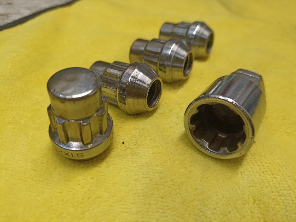Prodám použité bezpečnostní matice kol 12x1,5 kuželové sedlo. Plně funkční. Původní cena 390,- Kč