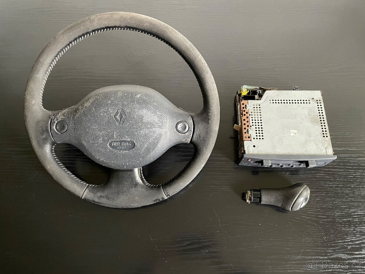 Kožený volant s airbagem k renovaci, originální autorádio, hlavice řadící páky.