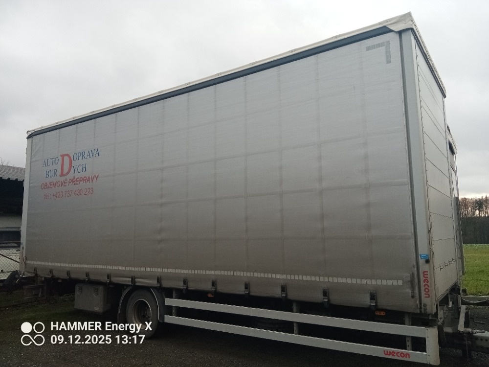Jednoosý tandemový přívěs do spodního závěsu s prům.oka 50.mm. Pneu 235/70R 17,5 s 50% vzorku,schránka na nářadí a schránka na hasičák.Najeto 220 tis.km. Při 156 tis.km. dělané komplet brzdy,nov.obložení,nov.bubny. Na přívěsu je 3straná schrnovací plachta s přizvedáváním střechy z levé strany. V zadu vrata,v předu hliníkové čelo až po střechu,ze vnitř vystužené dřevotřískou proti proražení.