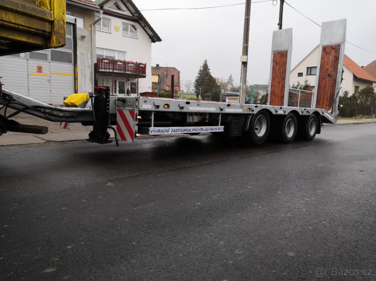 Nový přívěs německé výroby TOP kvalita,délka ložné plochy 7600mm,šířka ložné plochy 2550-3000mm výška ložné plochy 890mm,celková hmotnost 31000 kg, užitečné zatížení 25000 kg, tri nápravy SAF přední zvedací, zadní řiditelna s automatickou aretací při couvání, celožárově zinkováno vč podlahy, kotvící oka v podlaze přívěsu, TOP NĚMECKÁ KVALITA. JSME výhradní zastoupení pro ČR, termín dodání min.16 týdnů.