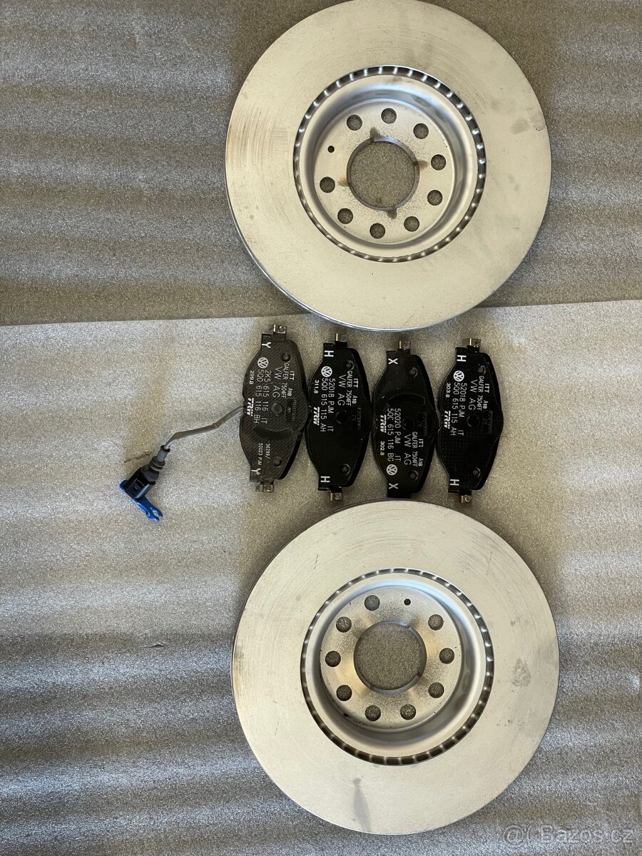 Prodám novou, originál sadu brzdových kotoučů s destičkami. Kotouč rozměr 312x25, 5Q0615301F/1K0615301AA. Destičky 5Q0698151F, 8V0698151A/B ,5Q0698151AH . Na vozidla Škoda, VW, Audi, Seat. Cena za sadu bez DPH.