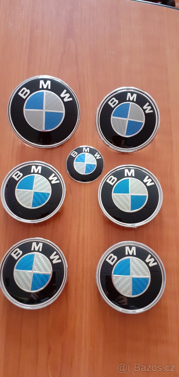 Bmw sada M3 M5 X1 X3 X5 X6 E36 E39 E46 E30 E39 motiv carbon modrý/stříbrný, červeno/stříbrný,znaky kapota 82 mm , 74 mm kufr,středy kol 68 mm .na volant jako darek pri koupi celku