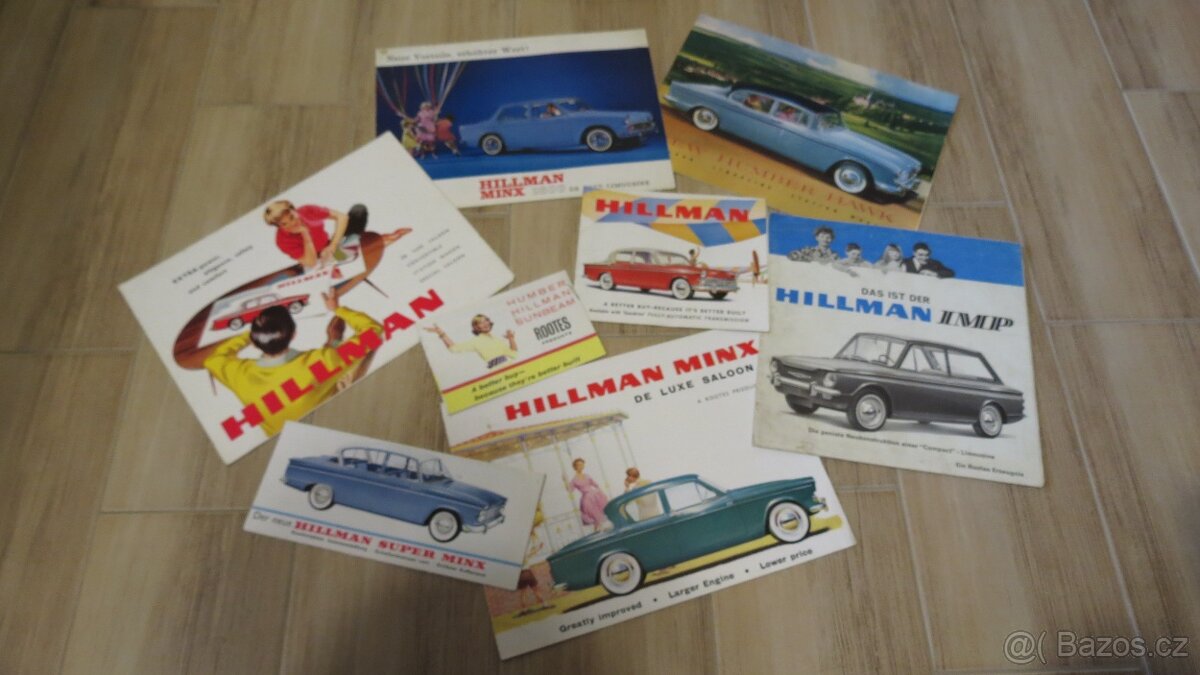 Prodám (možno i jednotlivě) zachovalé, raritní, originální dobové publikace z 60. let - prospekty výrobců Hillman, Humber, Sunbeam, Austin, Morris, Ford, MG a dalších, konkrétně např. k modelům Ford Anglia, Hillman Minx, Hillman IMP, Humber Hawk, Morris 1800 Mk II, MG 1100, Austin Maxi HL, Austin 1100, Reliant Regal, reklamní upomínkovou brožuru z návštěvy továrny Morris v Oxfordu a mnoho dalších. Velice zachovalý stav - viz foto. Vhodné pro fandy těchto značek a majitele veteránů. Dotazy na konkrétní prospekty prosím mailem, sdělím podrobnosti k jednotlivým publikacím (rok vydání, formát, počet stran, jazyk atd.). Případné cenové nabídky rovněž prosím mailem. Prodávám velké množství veteránských prospektů různých značek, podívejte se i na mé další inzeráty. Děkuji