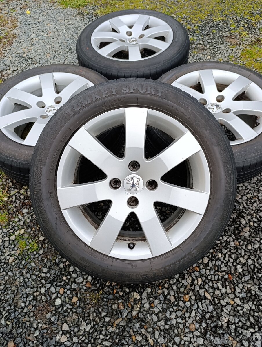 Originální Alu disky Peugeot, rozteč 4x108 rozměr 7x16 ET-32 středová díra 65,1mm. Obuté letní pneumatiky Tomket Sport o rozměrech 205/55 R16 91V DOT-2018 se vzorkem 6,5-7mm všechny. Pneumatiky v dobrém stavu, málo ježděné. Disky ve slušném stavu, nenakopané, bez oxidace, nějaké oděrky se najdou nejsou nové. Včetně originálních šroubů.