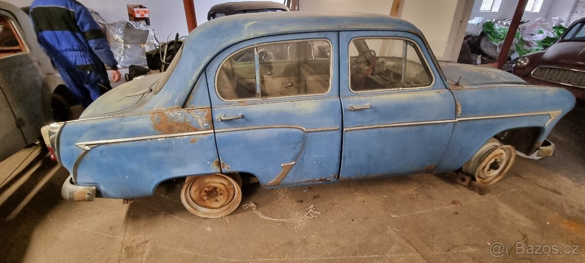 Prodám Moskvič 407 v nálezovém stavu, štítek nečitelný, chybí pneu, jinak kompletní.