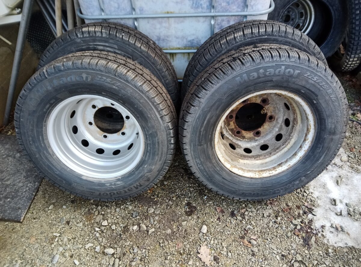 Prodám zánovní pneu Matador 225/75 R16C obuto na discích Iveco Daily. Jeden disk nový, 3 starší. Cena je za sadu 4 ks.