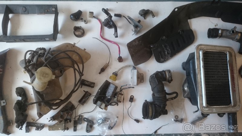 Pomocný spojkový válec s vedením, všemožné hadičky a trubičky serva, oleje, násosy vzduchu k brzdám a další plastové díly okolo motoru, držáky všech možných čidel a kabelů z motorového prostoru, nádobka na ostřik světel s motorkem a hadicema, různá čidla z motoru včetně origo lambdy, nepoškozený stock intercooler, piping k němu a vedení vzduchu, hlavice řadičky, oplastování vrtule k chladiči, druhá várka plastů z motoráku, S4 NA řidící jednotka, motorek pro tempomat (možno dodat i páčku a nějaké vedení), klimatizace, nádobka aktivního uhlí, motorky pro nastavování tuhosti předních tlumičů (možno dodat i panel s tlačítky), nádržka ostřikovačů s motorkem (pozor prasklá), přívod vzduchu k airboxu, cívky NA, kryt ECU, vyrovnávací nádržka chladiva, další plasty, trubičky, hadičky, klakson, nádobka brzdovky, relátka, náhon tachometru, další kopa držáků a plechy okolo výfuku. Pak pár věcí které nevím jestli vůbec nabízet, ale třeba by se ještě někomu hodily: zapalovací kably, nekompletní TII kabelový svazek (konektory se můžou hodit), přední pružiny, zadní pružiny (tlumiče ne, ty jsou mrtvé) a kompletní servo s držákem i hadicema.