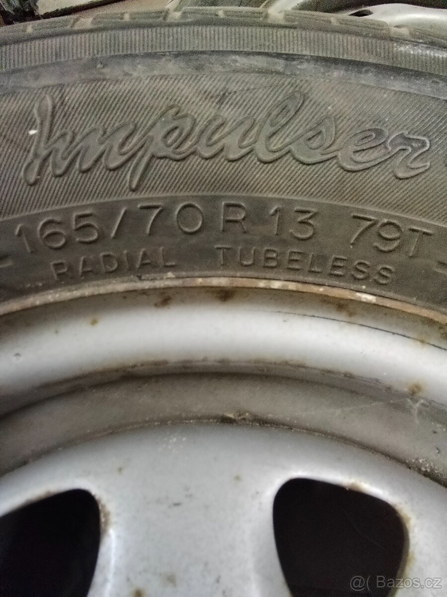 Prodám pneu 165/70/13 vzorek 6 mm jedná pneumatika boční průraz disky jsou z felicie 500,- za všechno osobní vyzvednutí
