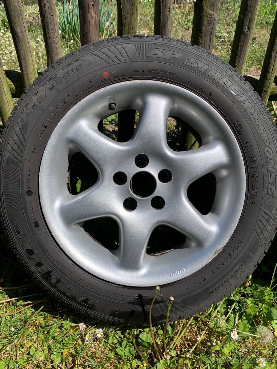 Prodám ALU kola s letní pneu 195/65 R15(pneu mají pěkný vzorem, ale jsou staré)skladované v suchu, jsou sundané z golfa IV. Stav viz foto. Cena za všechny 4ks !!!