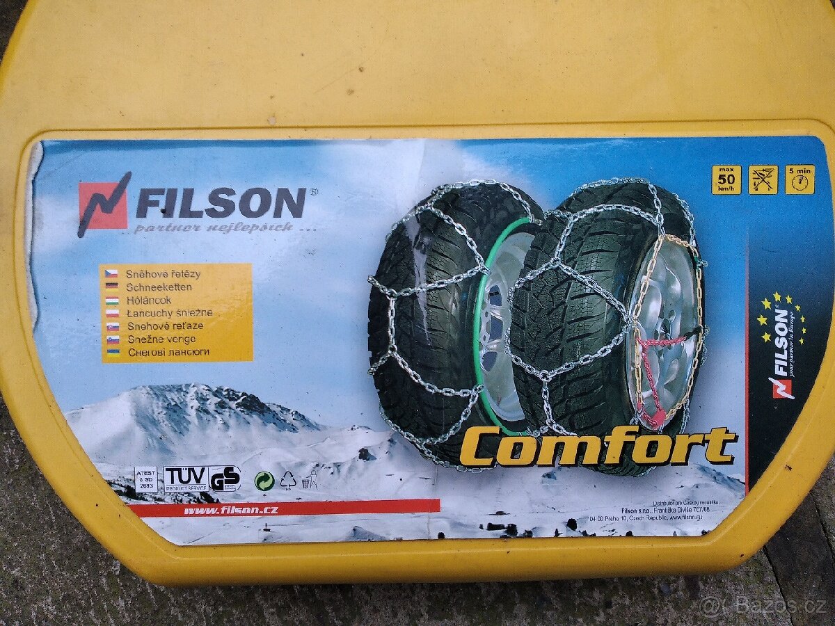 Sněhové řetězy Filson Comfort HN050. Rozměry kol, na které jsou vhodné viz. foto. Nezrezle. Předání okolí Kostelce či Praha