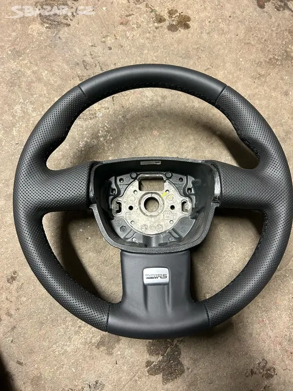 S-line Renovovaný volant Audi A4, A5, A6 - [12.2. 2026]Renovovaný volant Audi S-line, tříramenný, multifunkční, na A5, A4, A6. Bez airbagu. Poloperforovaná kůže, prošitý nití trikolora s-line.
