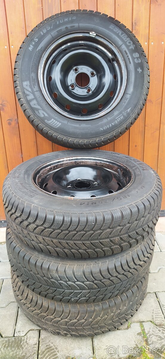 Zimní sada kol,185/70 R14,rozteč 4x108,Sava Eskimo S3+ Prodám sadu zachovalých plechových disků s téměř nejetými pneumatikami Sava Eskimo S3+, hloubka dezénu 8 mm (stejná hloubka jako u nové pneu), pneu mají najeto pouze 500 km!, kola jsou vyvážena. Disky pasují na vozidla s roztečí děr 4x108 mm, středová díra 65,1 mm.