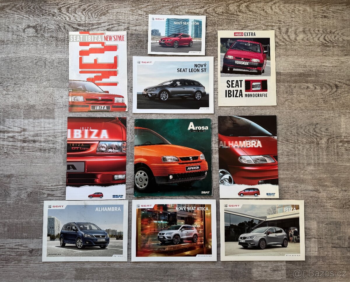 Prodám prospekty: Seat Alhambra, Seat Arosa, Seat Ateca, Seat Ibiza, Seat Leon. Cena: Alhambra 2 ks - 300 kč, Arosa - 250 kč, Ateca - 200 kč, Ibiza 4 ks plus ceníky - 500 kč, Leon 2 ks plus ceník - 300 kč, dílenská příručka Toledo a Leon 40 kč, vše - výhodnější cena.