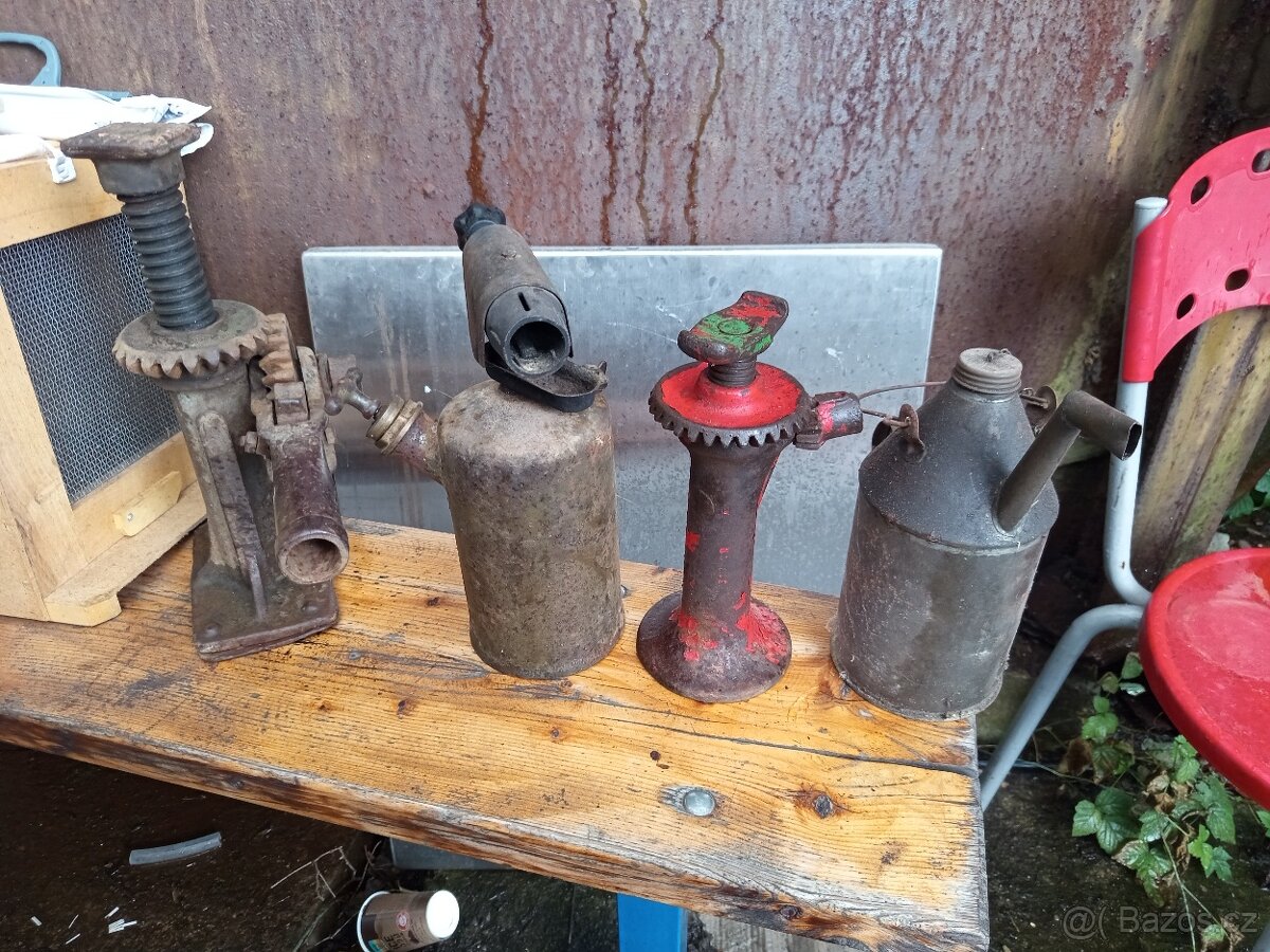 Prodám zvedáky auto pal, Autopal, konvička na olej petrolej, velká let lampa, Vhodné k veteránům a historické technice, dekorace do garáže nebo výbava do veteránů.