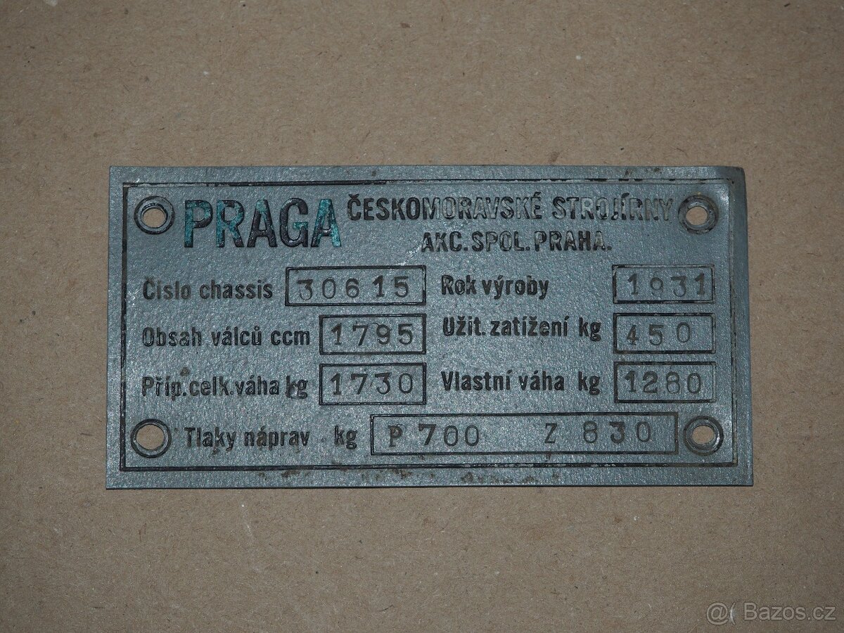 Prodám výrobní štítek na vozidlo Praga z roku 1931. --- Možno poslat přes GLS, PPL, Balíkovnu nebo Zásilkovnu (po platbě předem i na dobírku) nebo osobní odběr v Písku. --- Prosím pište na e-mail nebo volejte - na SMS neodpovídám. --- Inzerát je platný do smazání.