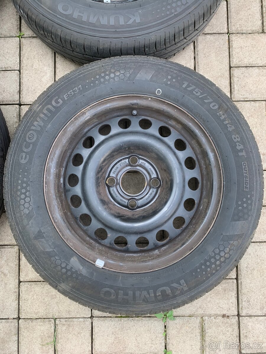 Prodám plechové disky 4x100 R14 na vozy Opel. Středová díra disku je 56.6mm, ET viz foto. Disky jsou obuty na letních pneumatikách KUMHO. Rozměr 175/70 R14. Pneumatiky jsou staré rok a půl.