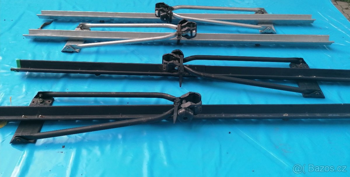 Držáky na střechu. 2 ks renovované, pozinkované, nerezové šrouby. Přidám další 2 ks zdarma, včetně náhradních čelistí. Předělány na T drážku.