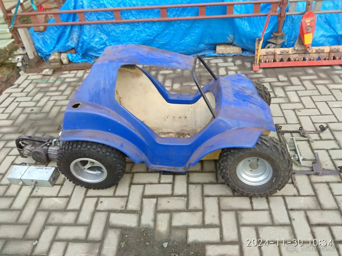 Prodám díly na dětskou bugynu Havel, nedokončený projekt, laminátový skelet, zadní náprava s diferenciálem a koly, nádrž, vnitřní uchycení přední nápravy a pedálů brzdy a plynu, vše nové nikdy nejeté+ přední kola s disky a motor babeta. Chybí řízení, přední náprava a volant. Vhodné pro děti od 5 - 12 let dle velikosti postavy