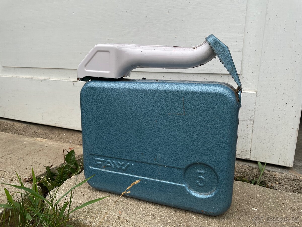 Prodám velmi zachovalý plechový kanystr Fawi o objemu 5 litrů s integrovanou nálevkou. Vnitřek jsem nezkoumal. Stylový doplněk pro veterány.