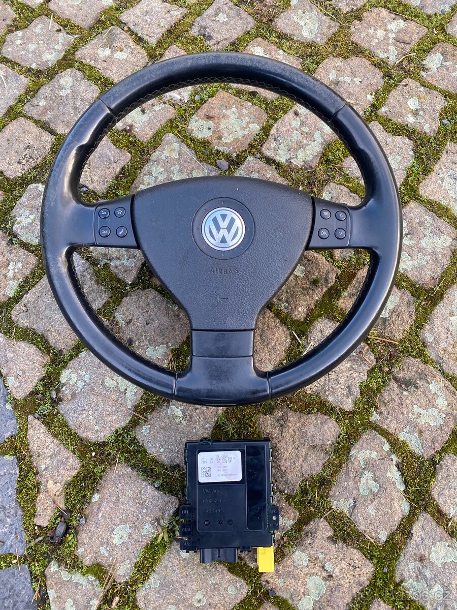 prodám kožený multifunkční volant s pádly společně s podvolantovou jednotkou. Volant ve stavu viz. foto (kůže jeví známky opotřebení). Volant demontován z vozu Volkswagen Passat B6 ale sedne i na jiné modely: Golf, Sharan, Touran, Transporter, Caddy, Polo, Lupo, Beetle, Brouk, atd...