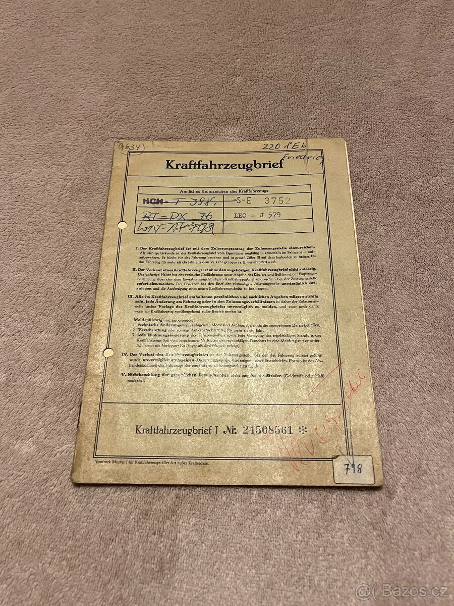 Prodám ke sběratelským účelům německý TP pro Mercedes 220SEb, výrobní řada W111. Šestiválcový benzinový motor 2,2 litru o výkonu 120PS. Uvedeno do provozu 17.5.1962