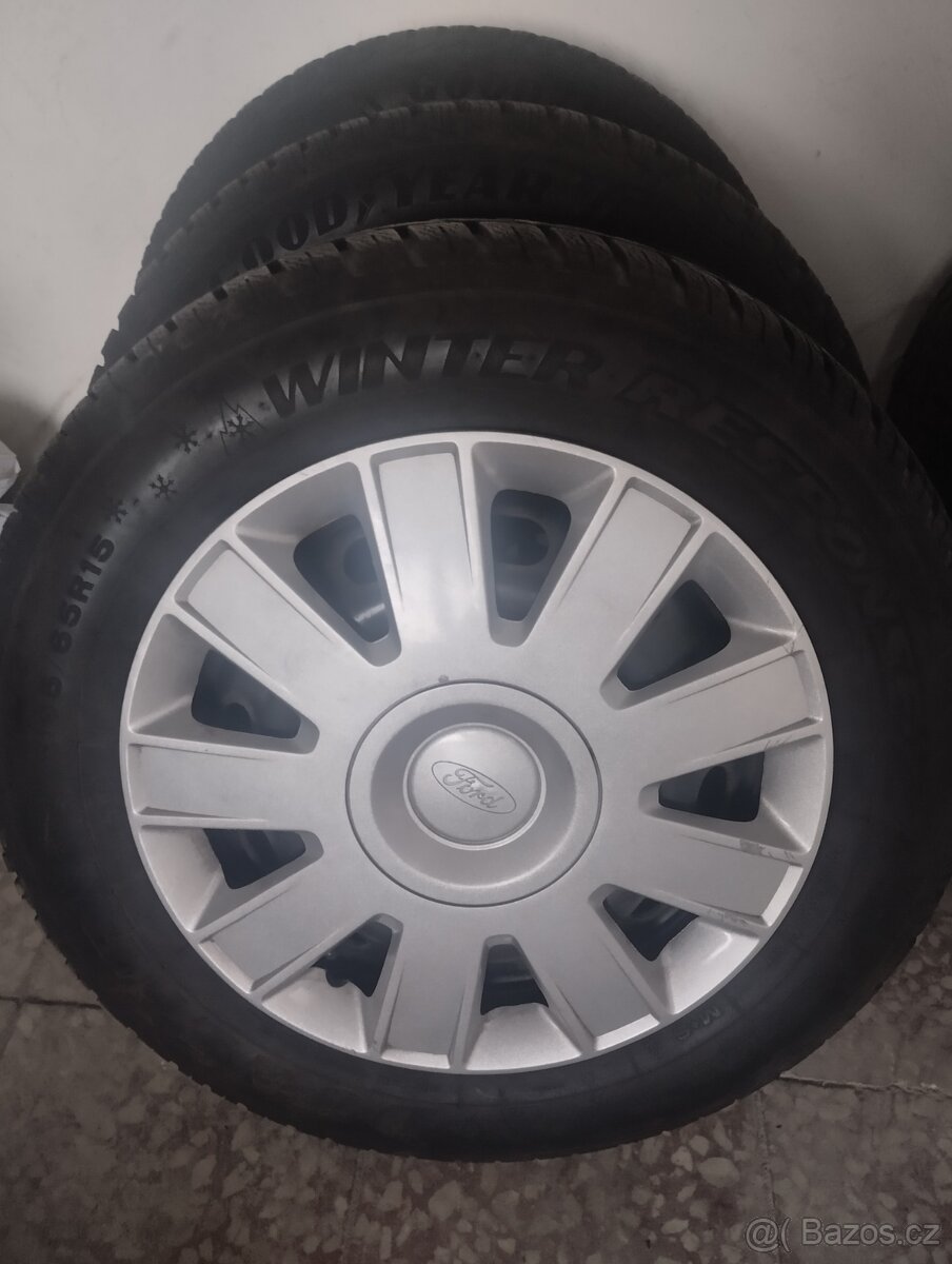 Disk 6jx15h2 et 52 5 se zimními pneu 195/65 R15 T z Ford Focus mk2, 2x Goodyear Ultra Grip a 2x Dunlop Winter Response 2 se vzorkem cca 5,5 mm. Originální poklice Ford Focus